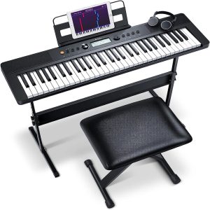 Για να διατηρηθεί ο φορητός χαρακτήρας του οργάνου, τα περισσότερα αρμόνια έχουν πληκτρολόγια με 5 οκτάβες, δηλαδή 61 πλήκτρα, απλά ή δυναμικά με ευαισθησία (touch sensitivity). Αυτή η λεπτομέρεια είναι πολύ σημαντική καθώς ένα αρμόνιο με δυναμικά πλήκτρα με ευαισθησία (touch sensitivity) είναι συνήθως κατάλληλο και για τα πρώτα στάδια μελέτης πιάνου, καθώς η λειτουργία αυτή μιμείται τον τρόπο που ανταποκρίνεται η ένταση κάθε νότας στο πάτημα του πλήκτρου. Όσο πιο δυνατά πατάμε ένα πλήκτρο τόσο πιο έντονα ακούγεται και η νότα που αναπαράγετε, όπως ακριβώς συμβαίνει και σε ένα πληκτρολόγιο πιάνου. Βέβαια αυτό είναι μόνο ένα μικρό βήμα καθώς το πληκτρολόγιο ενός κλασικού ή ψηφιακού – ηλεκτρικού πιάνου διαθέτει επίσης και βαρυκεντρισμένα πλήκτρα παρέχοντας ακόμη μεγαλύτερο ρεαλισμό στην αίσθηση παιξίματος. Όλα τα αρμόνια, εκτός από τα πολύ φθηνότερα, έχουν πλήκτρα πλήρους – κανονικού μεγέθους, καθώς οι σχολές συχνά συνιστούν στους γονείς τη χρήση αρμονίων ως εναλλακτική και πιο οικονομική λύση όταν το παιδί τους αρχίζει να μαθαίνει πιάνο – μπορούν όχι μόνο να χρησιμοποιούν ακουστικά για να μην ενοχλούν τους γείτονες(!), αλλά και το αρχικό οικονομικό κόστος δεν είναι τόσο υψηλό όσο σε ένα κλασικό πιάνο, ενώ αποφεύγεται και το κόστος της τακτικής συντήρησης που ένα κλασικό πιάνο έχει. Η ποικιλία πολλών διαφορετικών ήχων και ρυθμών μπορεί επίσης να ενθαρρύνει ένα παιδί να πειραματίζεται με τη μουσική και να κάνει την μελέτη πιο διασκεδαστική.