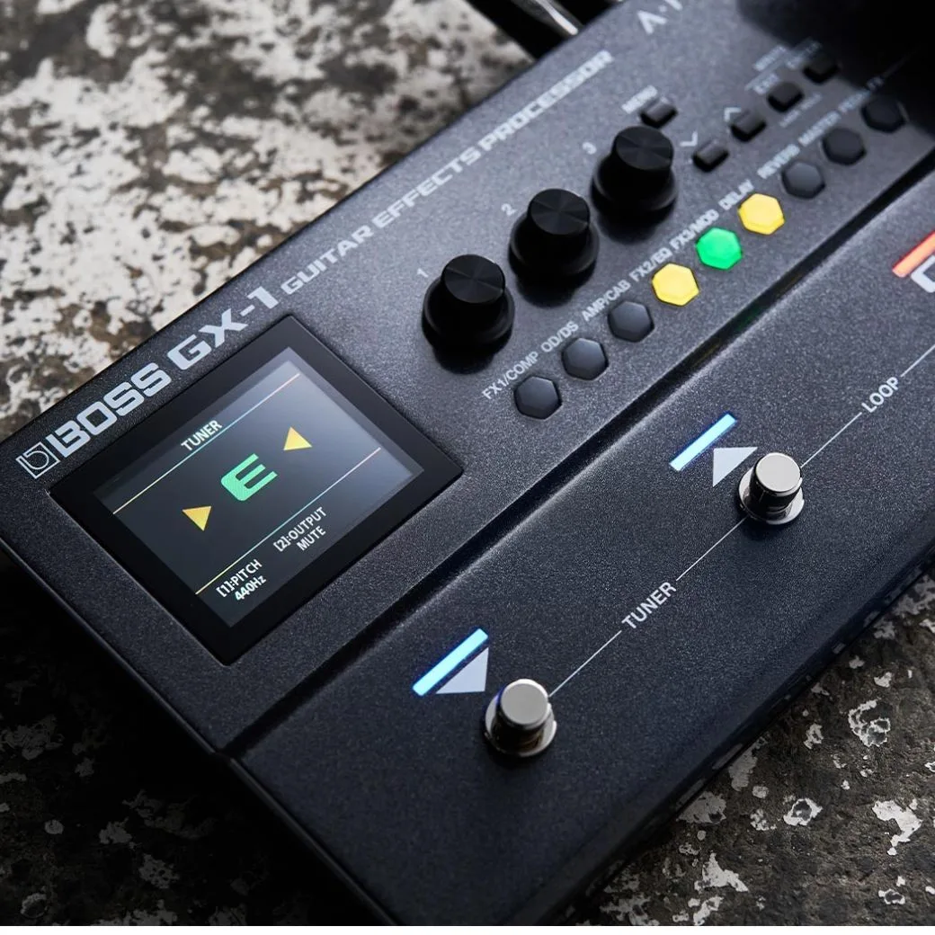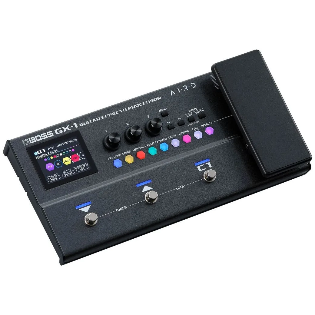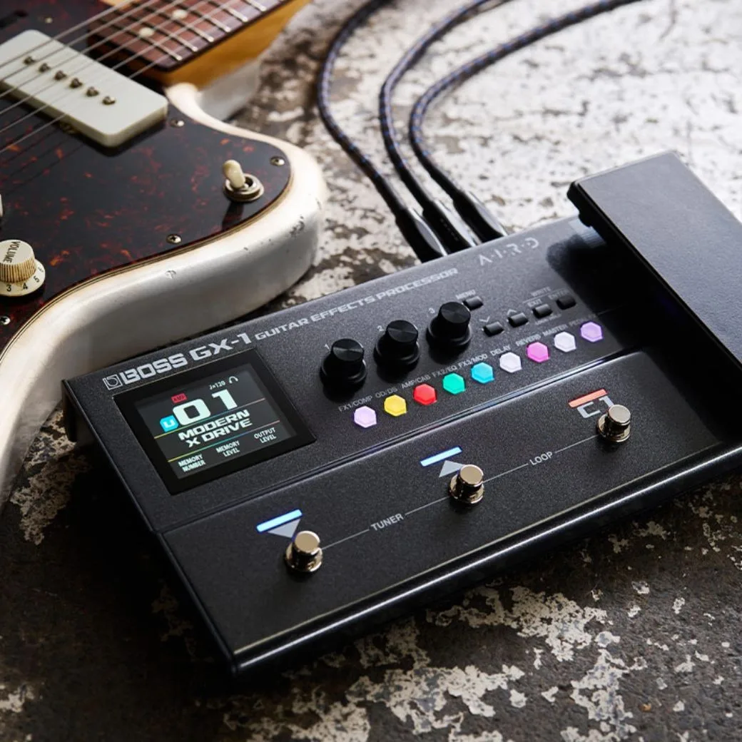 The GX-1 is your ultimate guitar companion delivering professional-grade sound and features in an ultra-portable platform for practice, recording, and performance. Authentic GX series amp and effect algorithms supply endless creative fuel, while the high-res color display, intuitive effect buttons, and Gear Suite tools make sound creation a snap. Rugged, powerful, and remarkably compact, the GX-1 is filled with inspiring tones for every guitarist, from beginning players to touring pros seeking an all-in-one travel solution with no-compromise sound. Powered by algorithms inherited from the GX-100, the GX-1 makes great tone accessible to every player, regardless of skill level. Explore 23 highly expressive AIRD amps, complemented by over 140 effects from the vast BOSS library. With adjustable effect order and eight simultaneous blocks plus a volume pedal and noise suppressor, you can easily craft custom setups for playing different music styles and performing specific songs on stage.