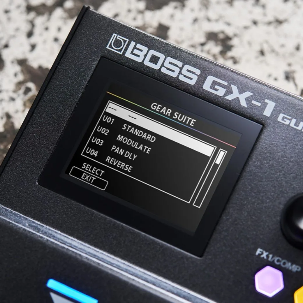 Whether editing presets or building sounds from scratch, the GX-1 is designed for frustration-free creation. Inspired by the GX-100 and GX-10 interfaces, the hexagon-shaped effect buttons provide a visual representation of the sound categories, and you can use them to turn effects on/off with a tap or access detailed parameters with a long press. You also get 99 memories loaded with ready-to-play presets, plus 99 user memories for storing your custom sound creations. The GX-1 introduces Gear Suite, a powerful new feature for dialing in amp and effect sounds fast. Each amp/effect type contains multiple factory Gear Suite settings, letting you recall a complete set of professionally tuned parameters with the turn of a knob. You can also edit effect parameters to taste and save favorites in user Gear Suite locations for instant access to personalized settings.