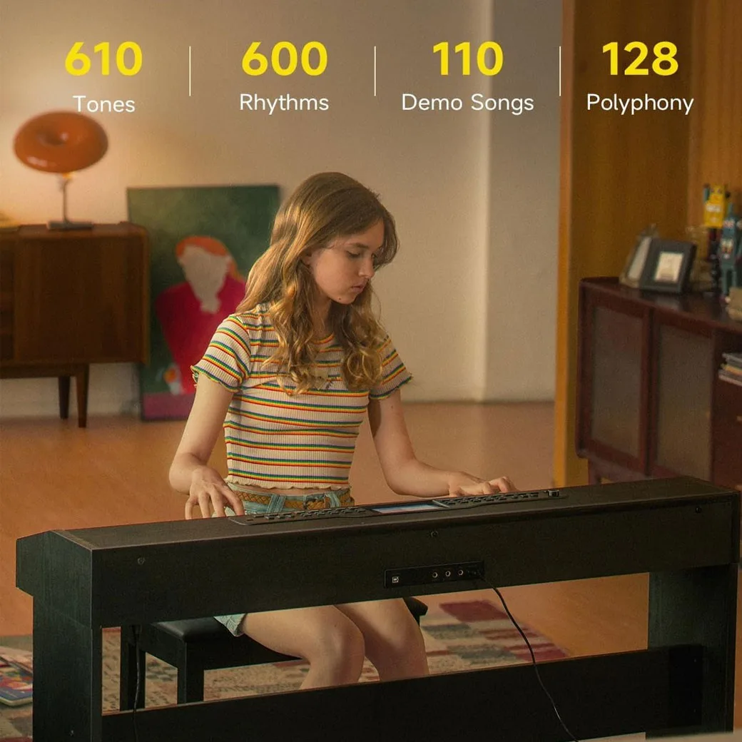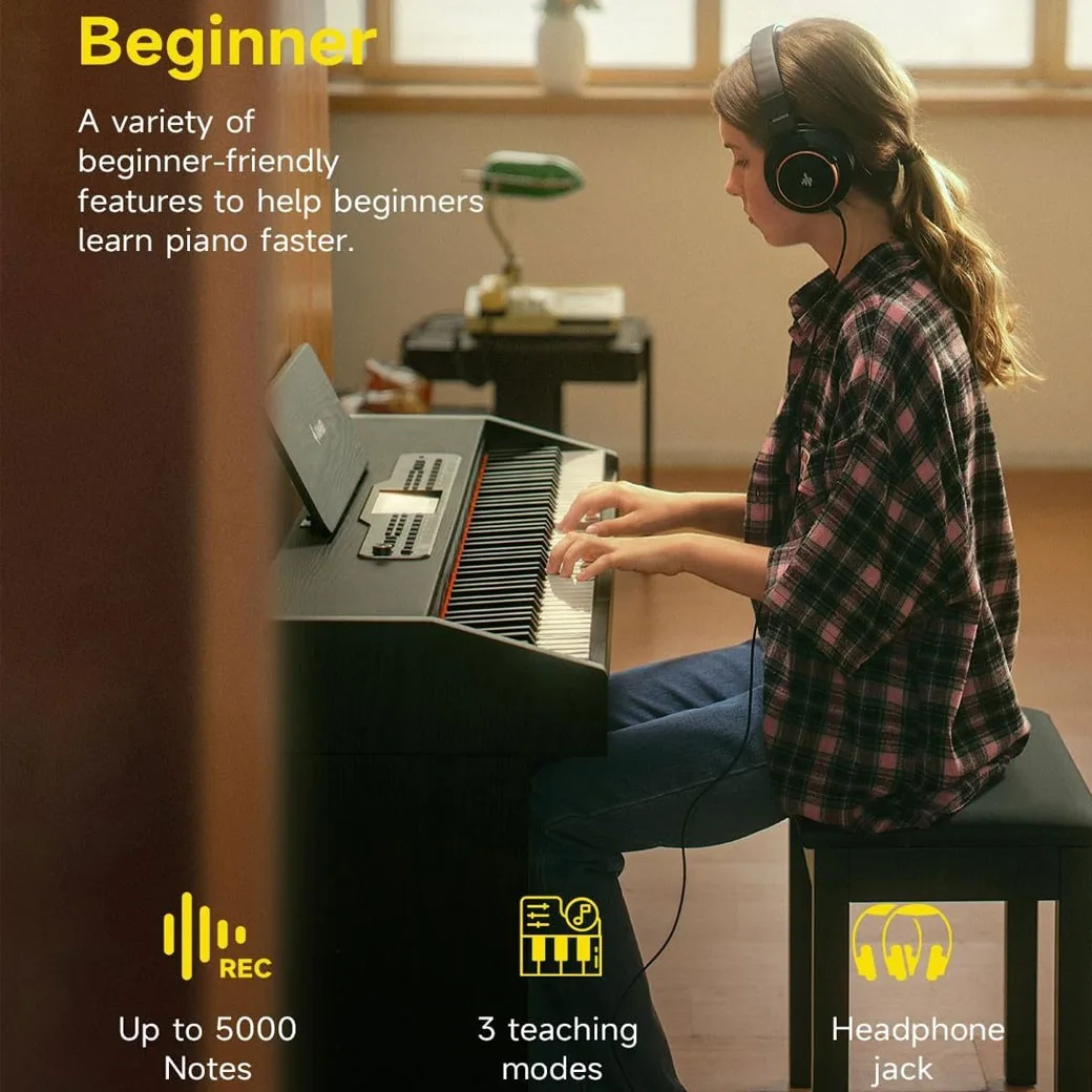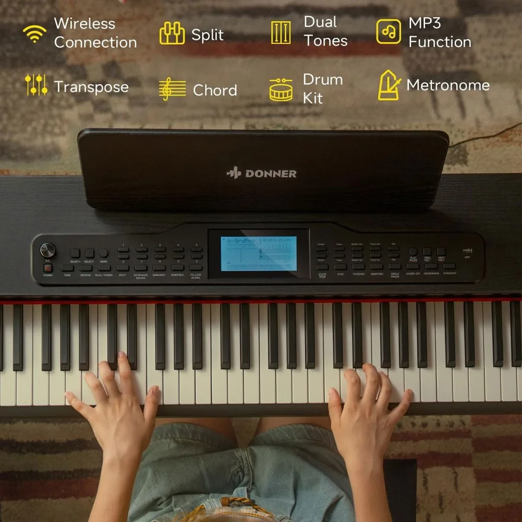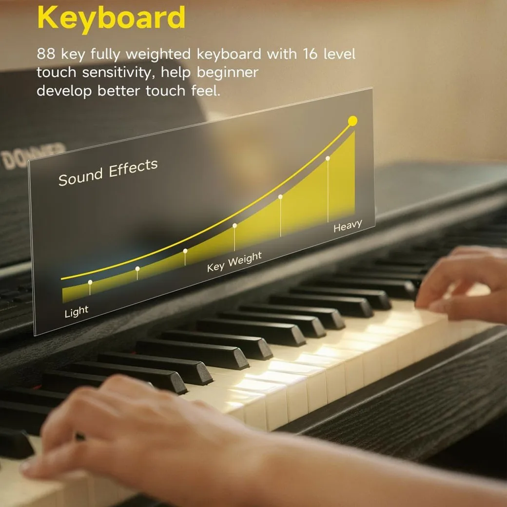 The DONNER DDP-95 is the ideal digital piano for musicians seeking a balance of authentic feel, quality sound, and elegant design. Built for both comfort and learning, it delivers a playing experience that closely resembles an acoustic piano, making it a perfect choice for students, hobbyists, and advancing players alike. Equipped with 88 full-size graded hammer action keys, the DDP-95 responds faithfully to every touch, offering dynamic and expressive performance. Its carefully sampled tones deliver a rich, natural sound, while the wide range of voices and rhythms allows players to explore multiple musical styles — from classical and romantic repertoire to pop, rock, and contemporary music.