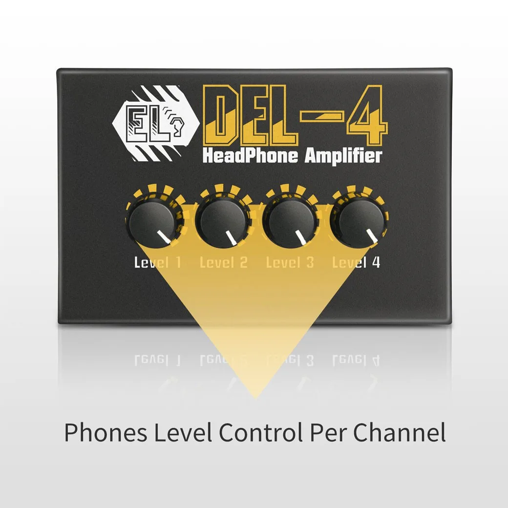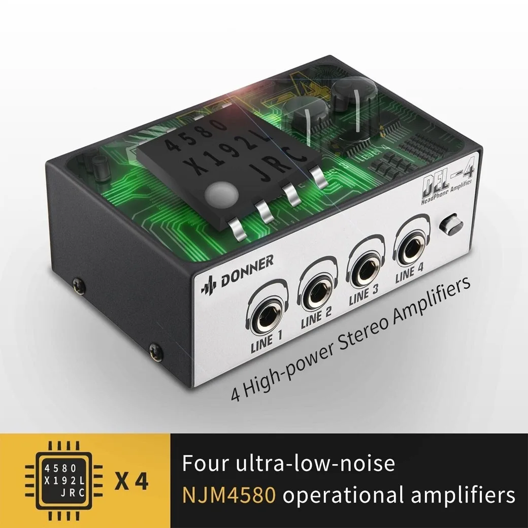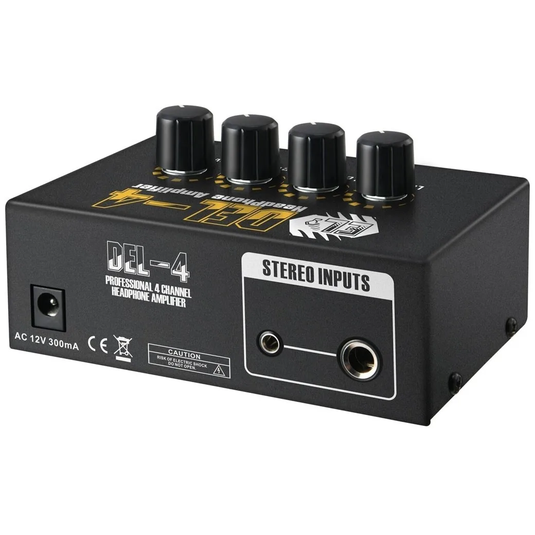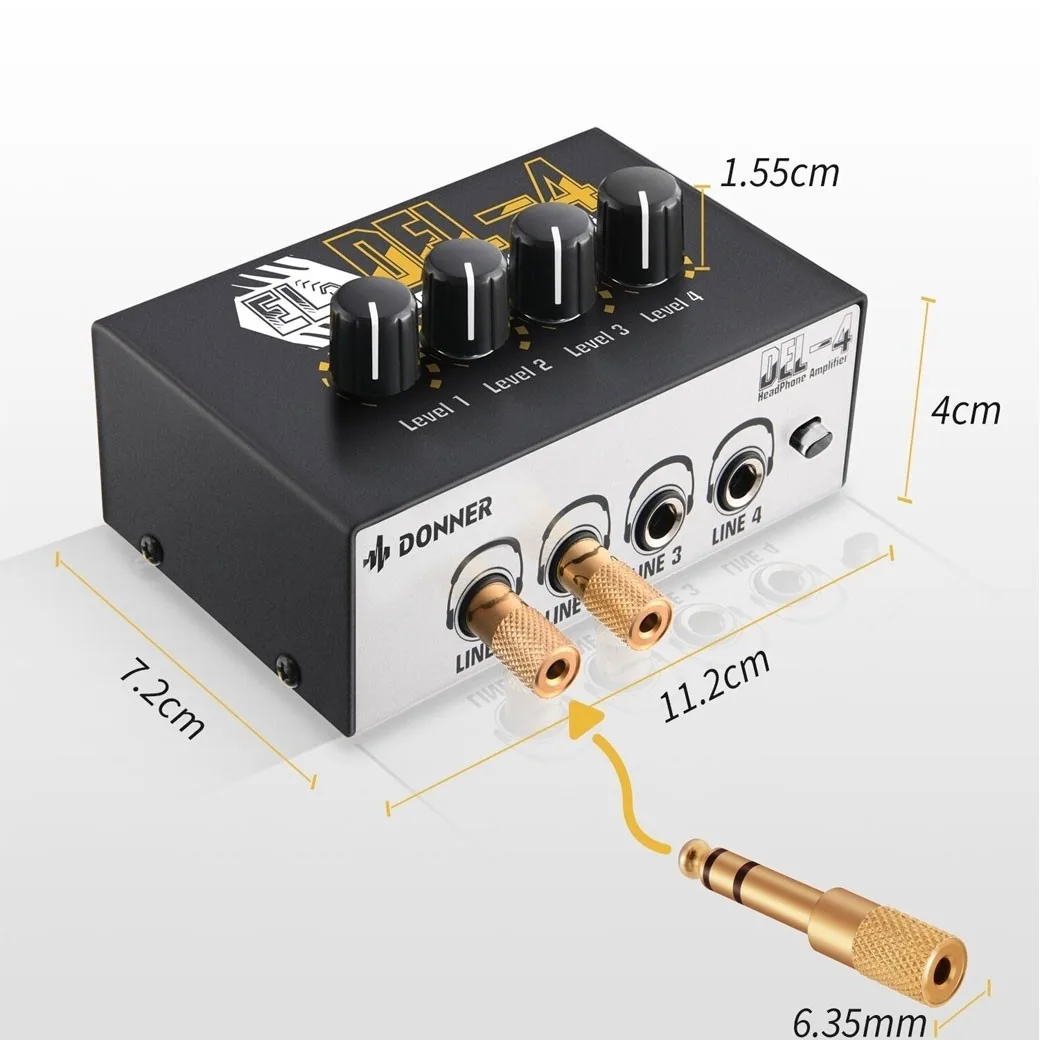 The Donner EC1239 DEL-4 is a professional-grade headphone amplifier designed to deliver clean, dynamic, and well-balanced sound. Perfect for recording studios, rehearsals, and live performances, it ensures multiple users can monitor audio simultaneously without any loss in quality. With its rugged, portable design and low-noise performance, the DEL-4 is an excellent choice for musicians, producers, podcasters, and audio engineers who demand reliable monitoring. Each of the four headphone outputs comes with independent volume control, giving every listener a customized monitoring experience. Compact yet powerful, the DEL-4 offers high-quality amplification and ergonomic operation, making it a versatile tool for both professional and home studio setups.