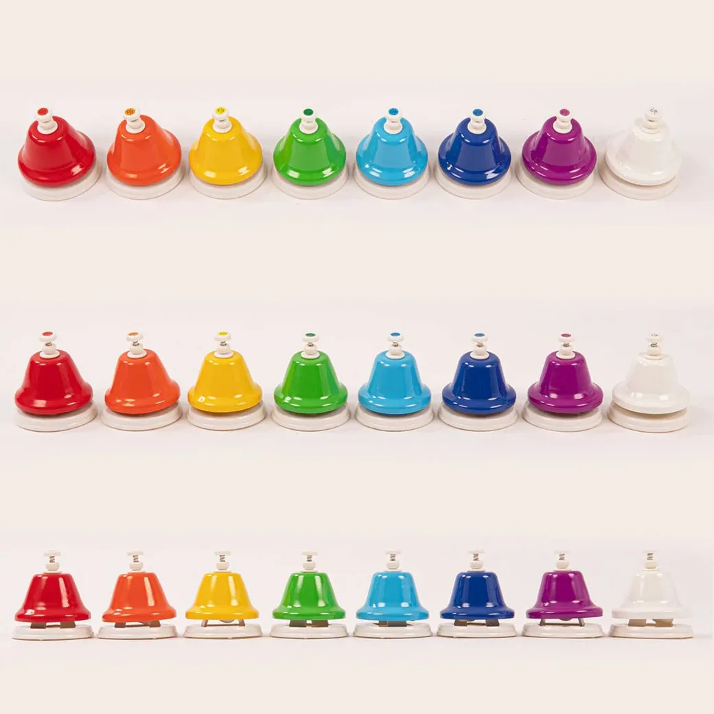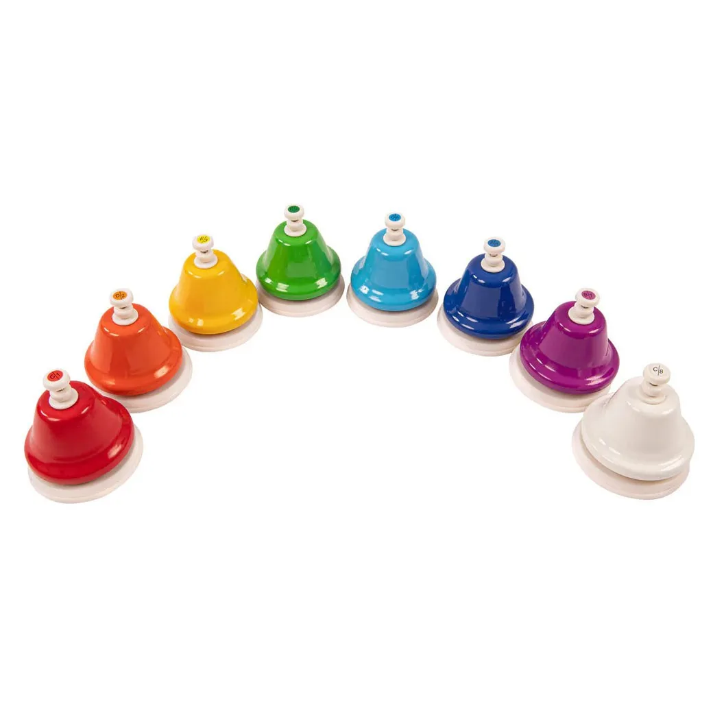 • Vibrant-colored metal bells on a tabletop base with non-slip feet